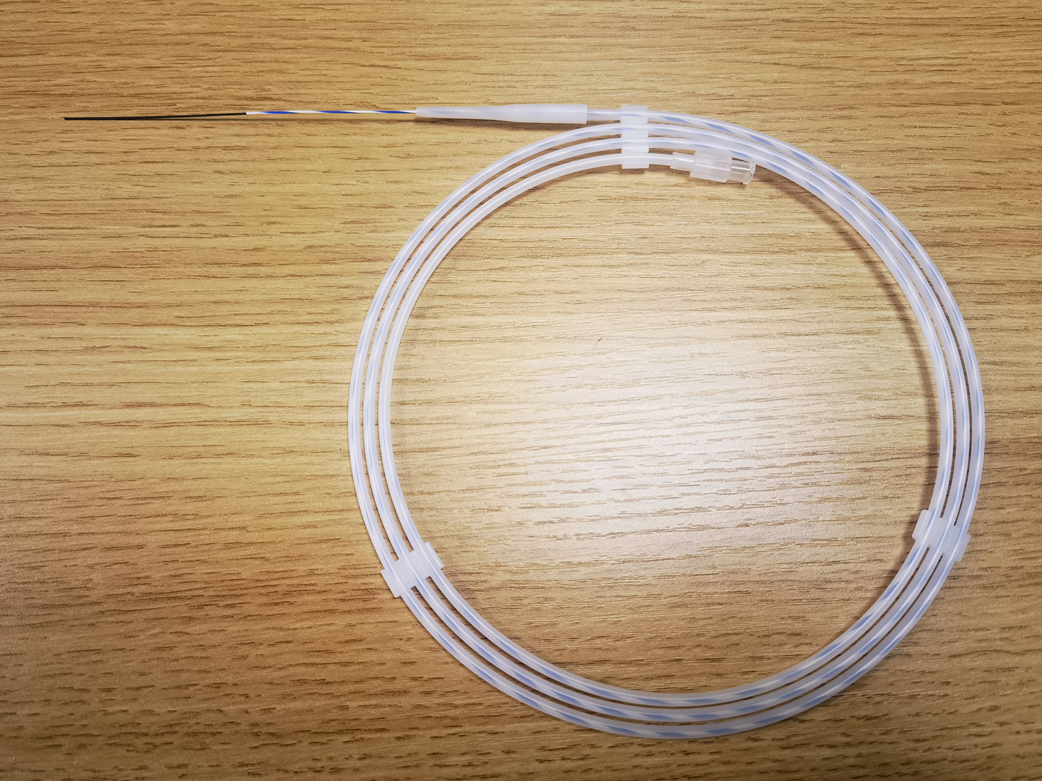 It is a type of hybrid technology disposable guide wire used for negotiating tract in urology surgery, the material of the wire core is kink-resistant nitinol, the surface is blue and white stripes that could provide clear visualization of wire movement, and the hydrophilic distal tip is ultra soft for easier entry in some complicated anatomy.